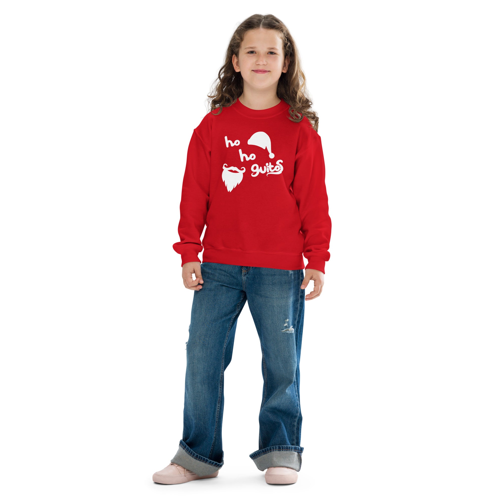 Cozy and cool, this festive youth crewneck sweatshirt is designed for every holiday adventure! Part of the guitos Seasonal Collection, this vibrant red Christmas top features the unique "ho ho guitos" phrase alongside playful Santa hat and beard graphics in white.