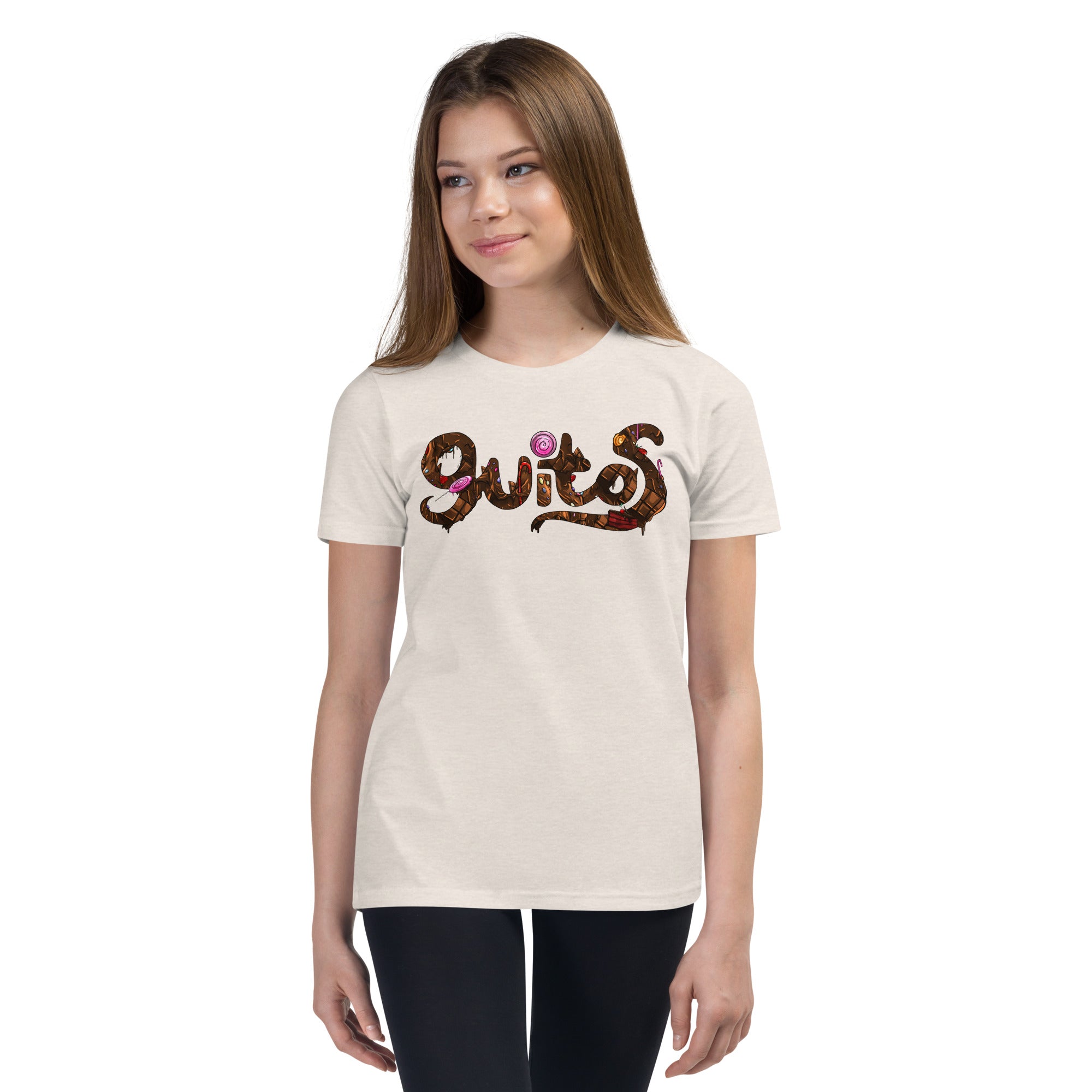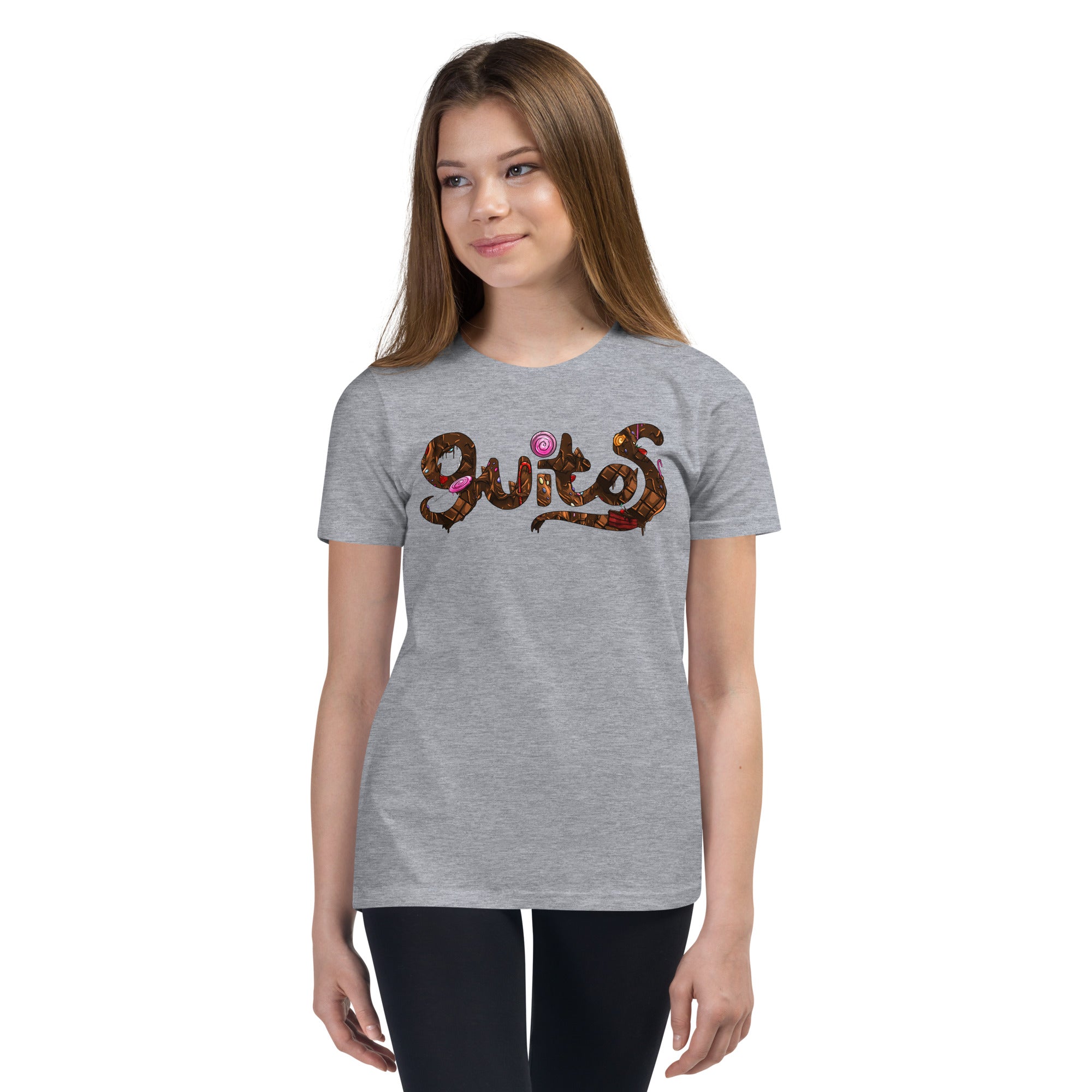 This soft and comfy guitos brand youth tee is bound to become a favorite in your young wardrobe. It features the guitos logo in gecko Stash's chocolate and sweets style, with an iconic pink and white swirly lollipop candy dotting the "i".