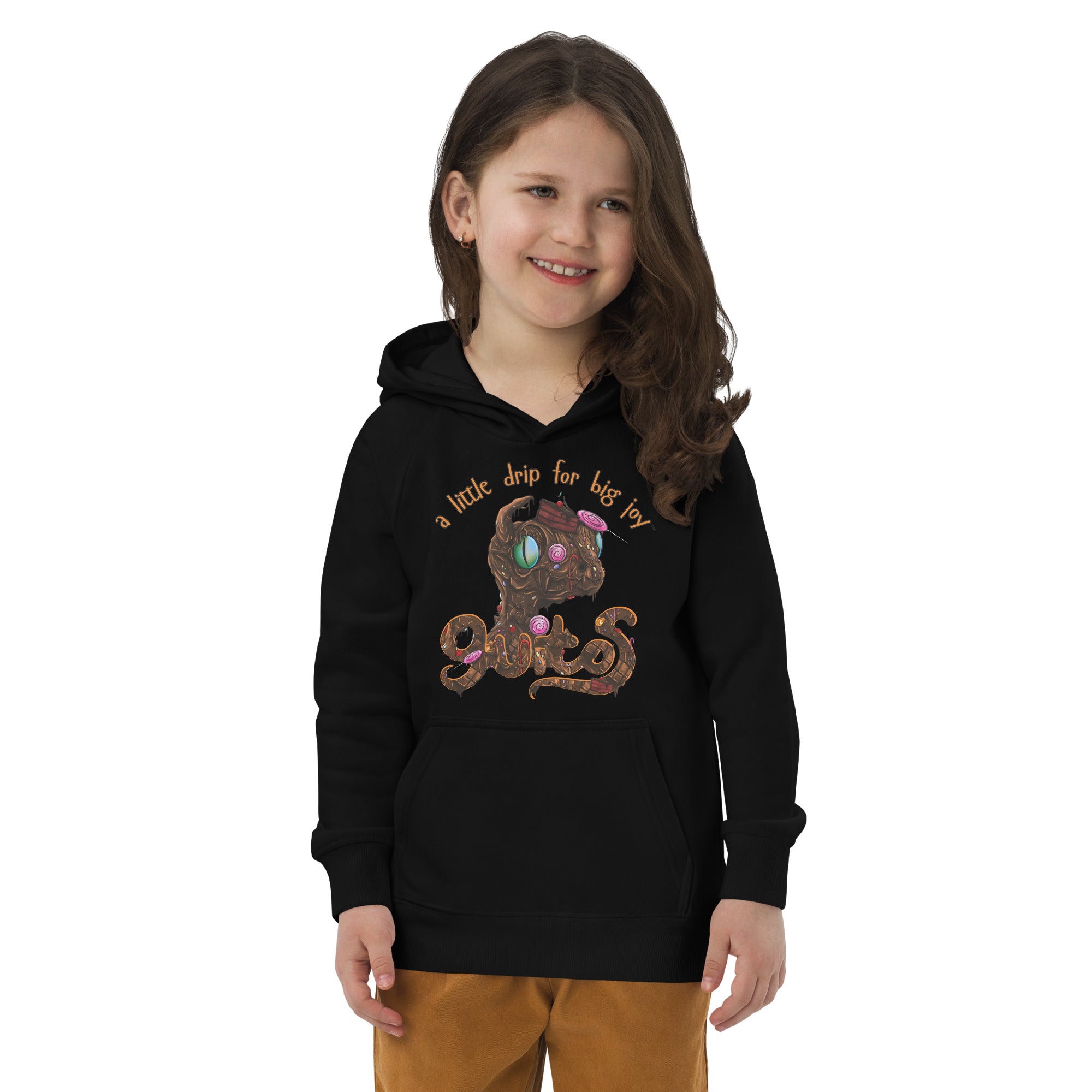 "Drip" means style, and this is the perfect premium hoodie for your fun and stylish little ones. This super comfy guitos brand youth eco-friendly, organic cotton hooded sweatshirt has chocolate and sweets gecko Stash and matching logo on the front, ribbed cuffs, and a lined hood for additional warmth. The guitos phrase "a little drip for big joy" ™ is written in orange font.