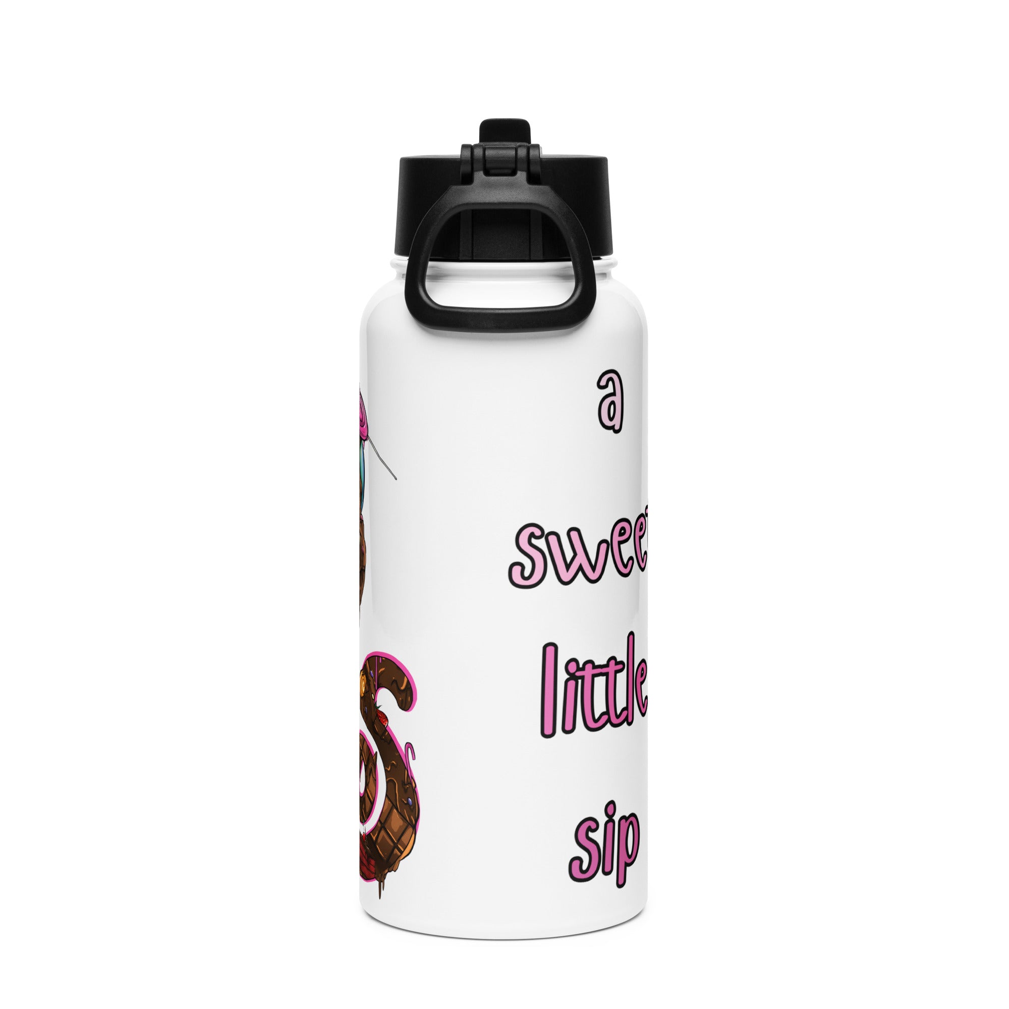 Make hydration a little sweeter! This 32 oz stainless steel water bottle features a fun chocolate candy gecko design and the phrase "a sweet little sip," making it the perfect companion for workouts, school, or busy days.